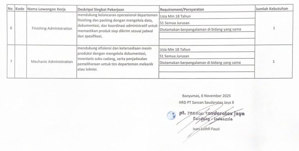 PT Sansan Saudaratex Jaya 8 merupakan bagian dari PT Sansan Saudaratex Jaya, sebuah perusahaan manufaktur tekstil dan garmen terkemuka di Indonesia. Berfokus pada produksi pakaian jadi (garmen) berkualitas tinggi yang ditujukan untuk pasar ekspor global. Sebagai salah satu unit pabrik yang dimiliki grup tersebut, Sansan Saudaratex Jaya 8 secara spesifik memproduksi berbagai macam produk pakaian seperti kemeja dan celana untuk memenuhi permintaan merek-merek internasional, dengan lokasi operasional di Desa Kalibagor, Kecamatan Kalibagor Banyumas, menempati gedung Eks. Pabrik Gula Kalibagor.